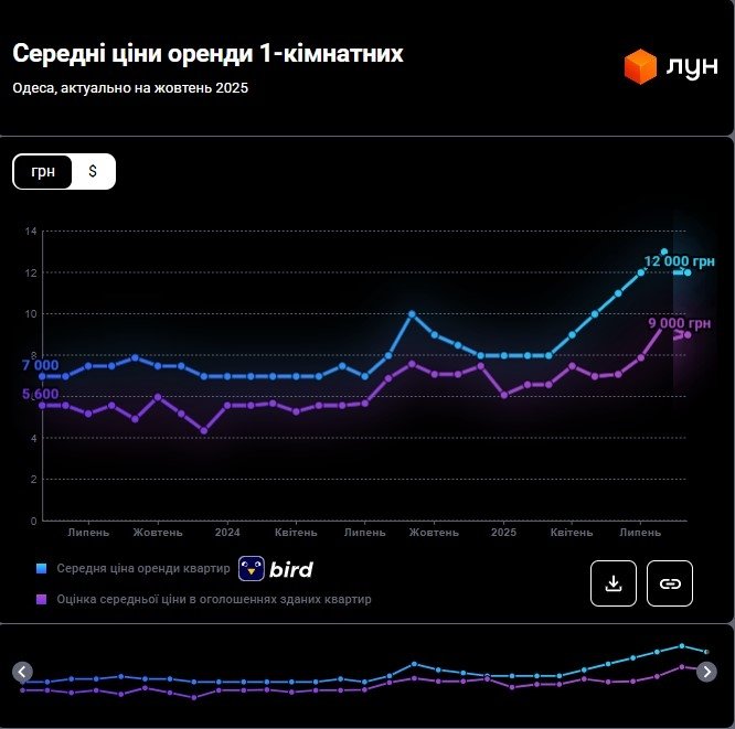 За даними ЛУН Статистика, у жовтні 2025 року середня вартість оренди однокімнатних квартир у нижньому ціновому сегменті зменшилася. Якщо у вересні орендодавці пропонували житло в середньому за 13 000 гривень, то в жовтні ціна знизилася до 12 000 гривень, що становить приблизно 7,7%. Водночас орендарі, які у вересні орендували квартири в середньому за 9 500 гривень, у жовтні сплачували близько 9 000 гривень, тобто на 5,3% менше, ніж місяцем раніше.