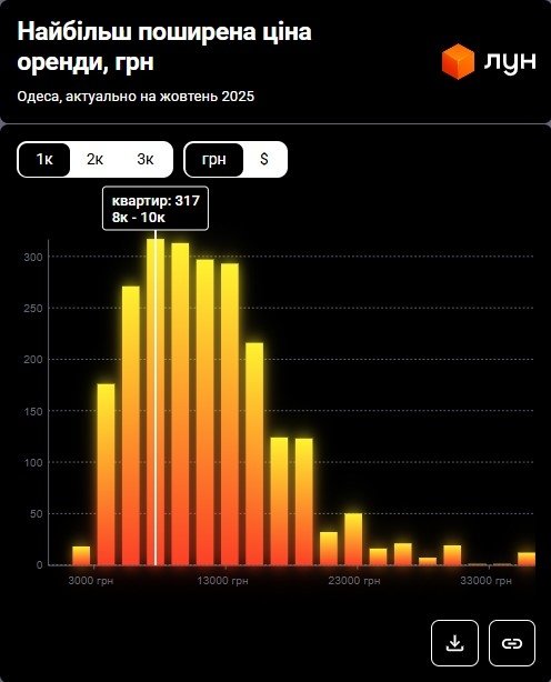 Згідно з даними ЛУН Статистика, станом на жовтень 2025 року найбільш поширена ціна оренди 1‑кімнатних квартир у Одесі становить 8 000–10 000 грн.