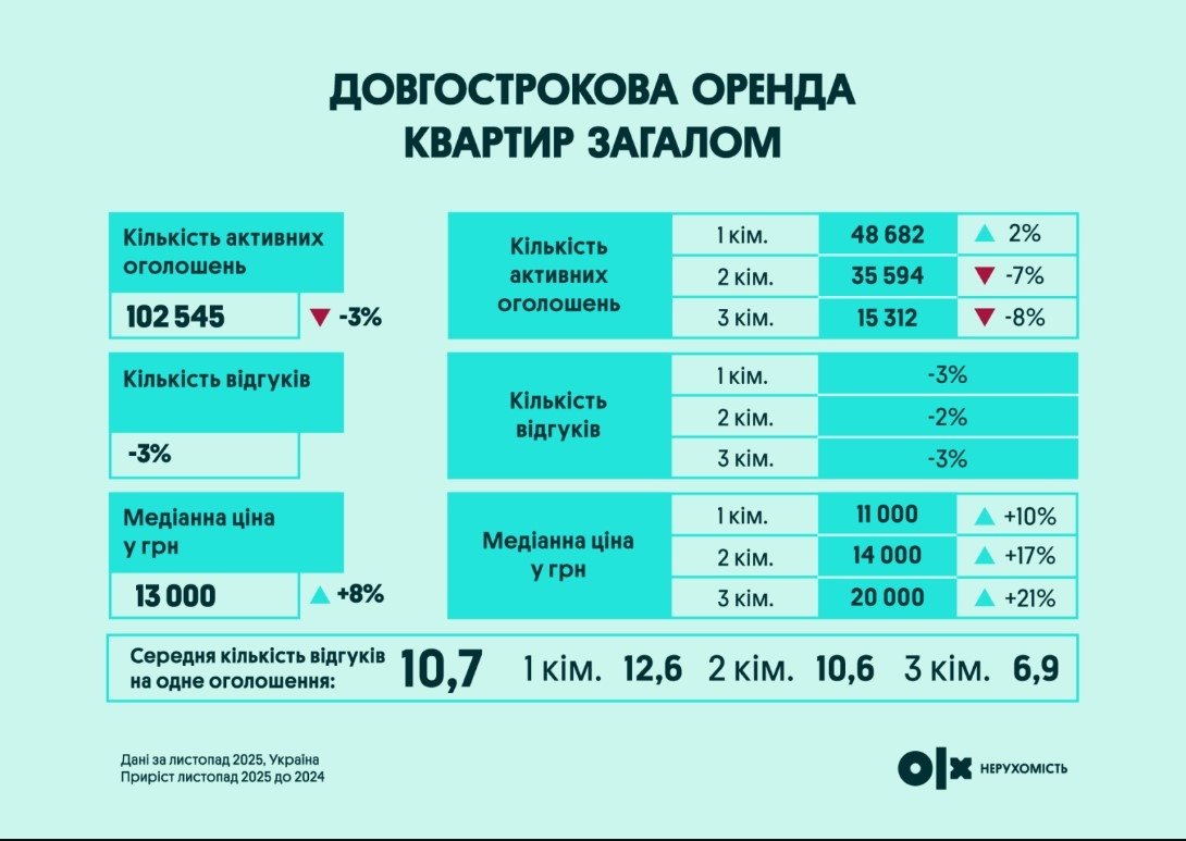 У 2025 році попит на оренду будинків зріс на 19%, при цьому на одне оголошення приходило в середньому 12 відгуків – один із найвищих показників на ринку. Кількість активних оголошень впала на 11%, що підняло середню ціну оренди по Україні на 13%.