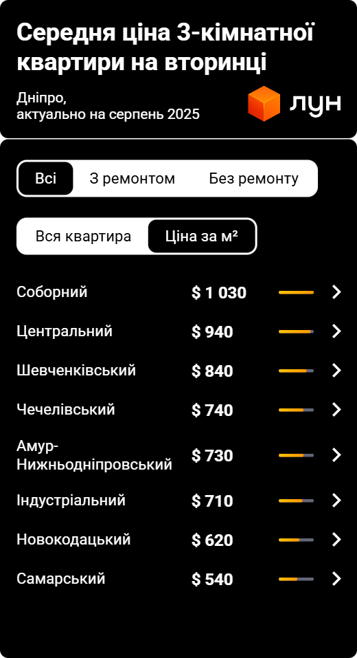 - Самарський район: 540 – 590 доларів/м.кв (найбюджетніший район).