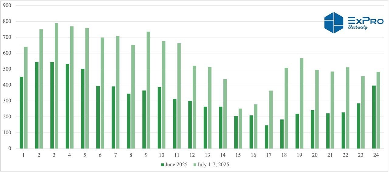 Средний почасовой экспорт электроэнергии в июне и июле 2025 года, МВт-час