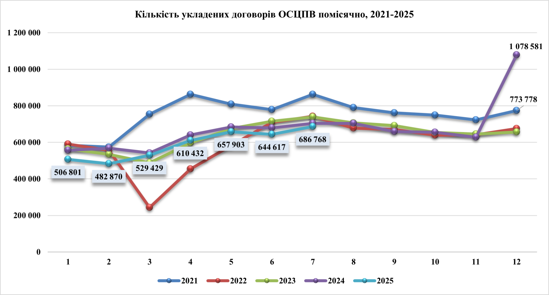 Закон "Об обязательном страховании гражданской ответственности владельцев наземных транспортных средств", принятый в прошлом году, оказал большее влияние на показатели украинского рынка ОСАГО в 2025 году, чем в 2024, кроме "технического" роста заключения договоров в декабре 2024, о котором я упомянул выше.