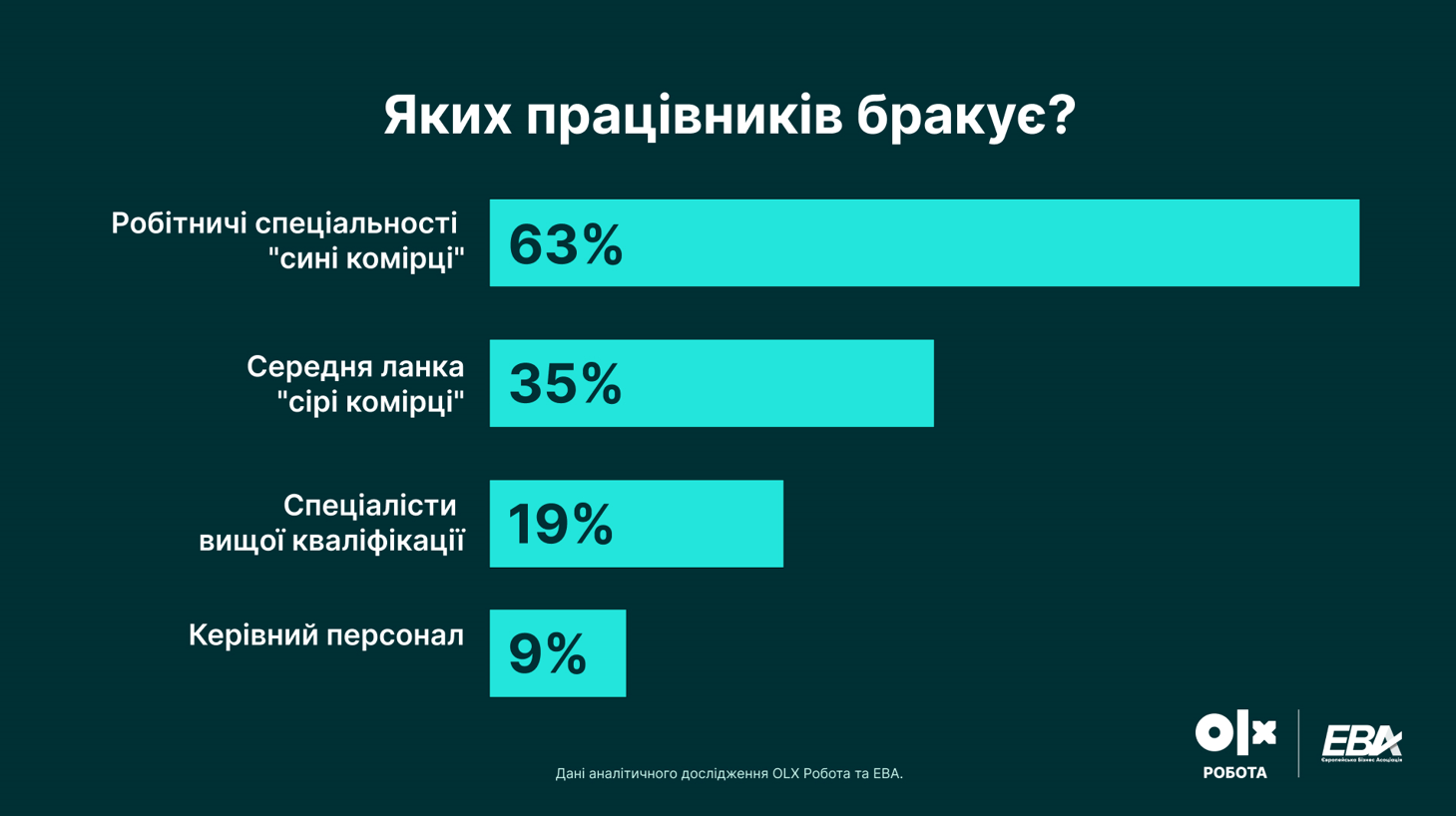 По словам руководительницы платформы OLX Работа, на рынке труда Украины больше недостает работников рабочих специальностей — 63%, работников среднего звена — 35%, специалисты высшей квалификации — 19% и 9% — руководящего персонала.