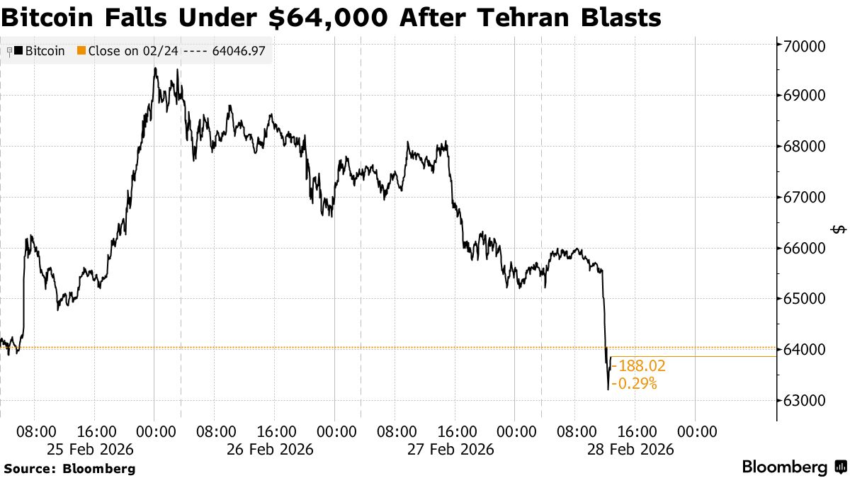 Цены на биткоин и другие криптовалюты резко снизились после того, как США и Израиль нанесли удары по целям в Иране, повлекши волны продаж на высокорисковых активах.