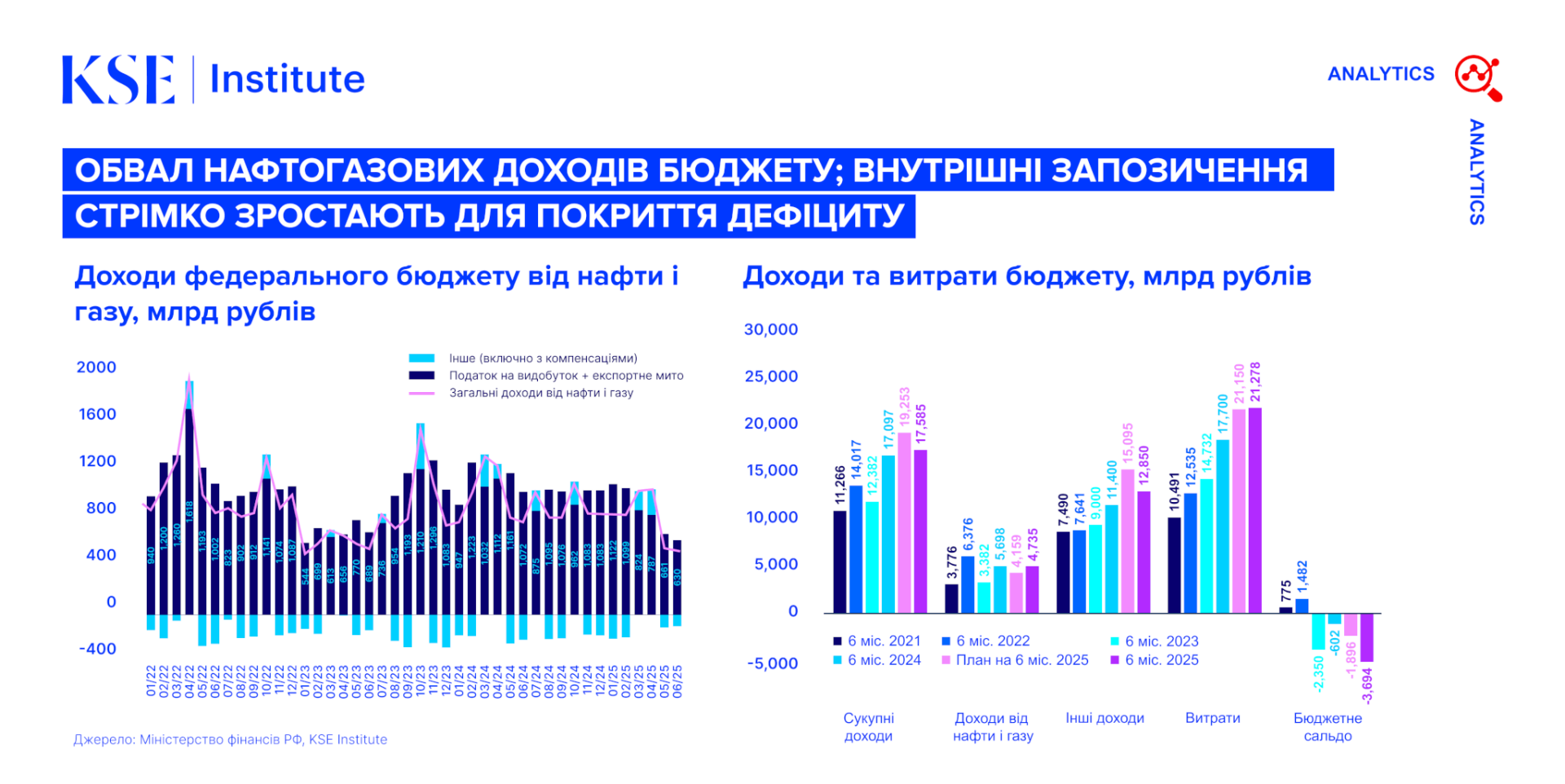 В июльском выпуске Russia Chartbook, обнародованном аналитиками KSE Institute, отмечается стремительное углубление финансовых проблем России. Основным вызовом для российской экономики в 2025 году остаются низкие цены на нефть, ограничивающие возможности Кремля финансировать военную агрессию.