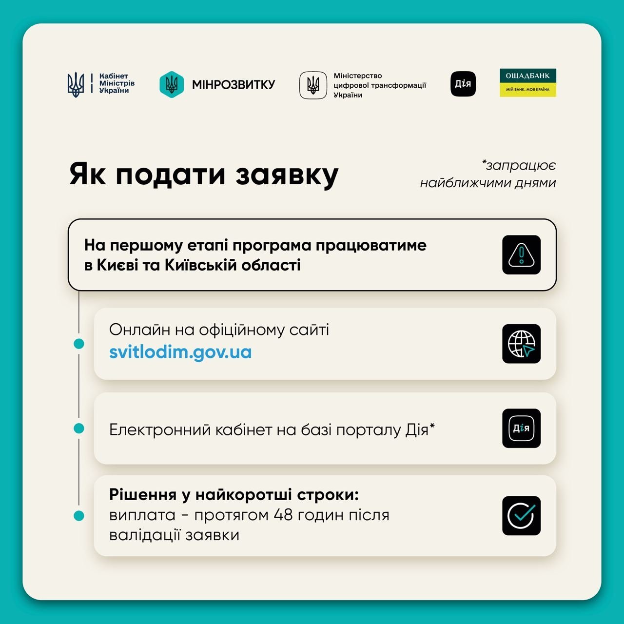 Свириденко отметила, что программа будет действовать в общинах с чрезвычайной ситуацией в энергетике, начиная с Киева и области. О старте подачи заявок на получение помощи в рамках программы дополнительно уведомит Минразвития.