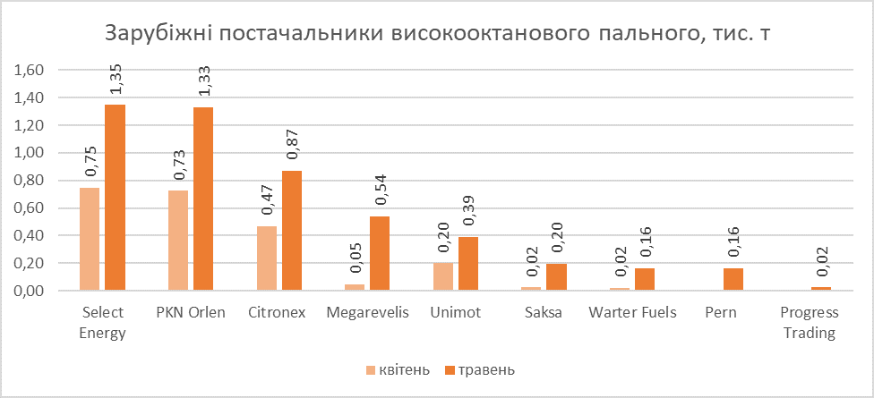 По данным аналитиков, крупнейшим поставщиком остается UPG, завезшая 1,5 тыс. т бензина: 90% с помощью трейдера Select Energy, остальное — от польского производителя Warter Fuels.
