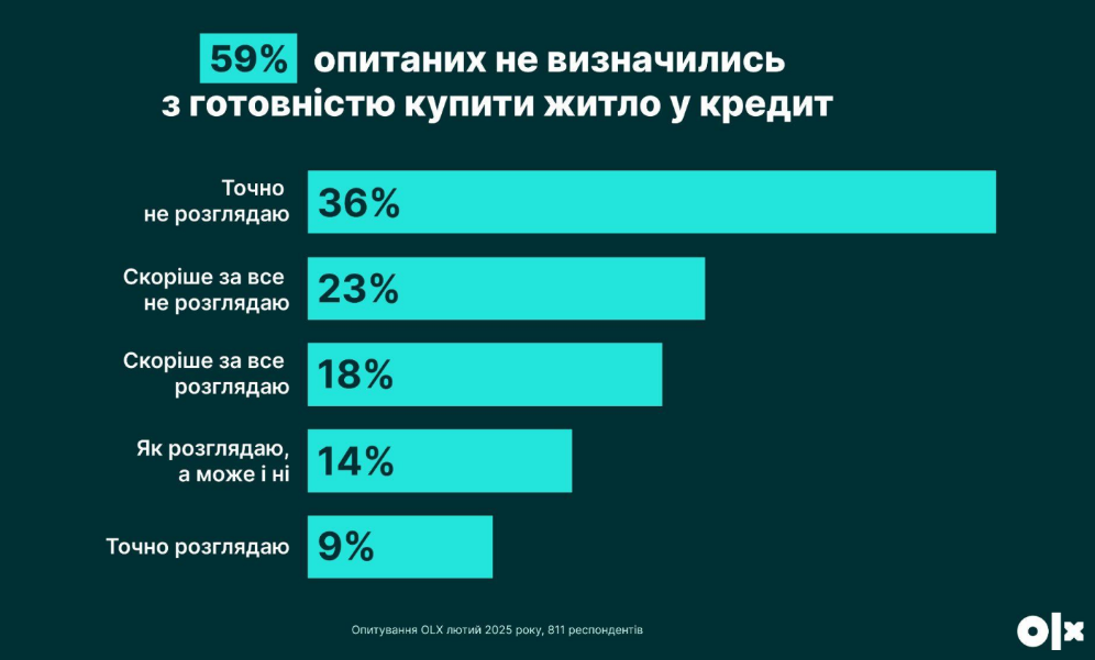 Украинцы не торопятся покупать недвижимость в кредит. Спрос на жилищную ипотеку остается неопределенным: 59% еще не решили, готовы ли к такому решению, 36% точно не рассматривают такую возможность. Об этом сообщило Delo.ua со ссылкой на исследование Olx Недвижимость.