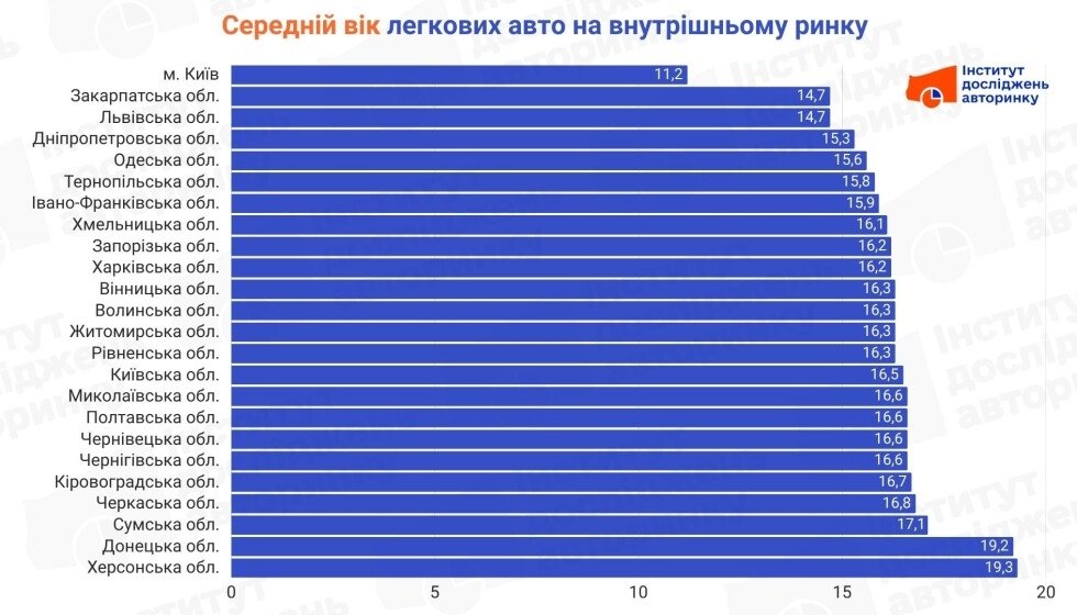Самым старым автопарком есть Херсонская (19,3 года) и Донецкая (19,2 года) области. Здесь сказываются экономические проблемы и последствия войны.