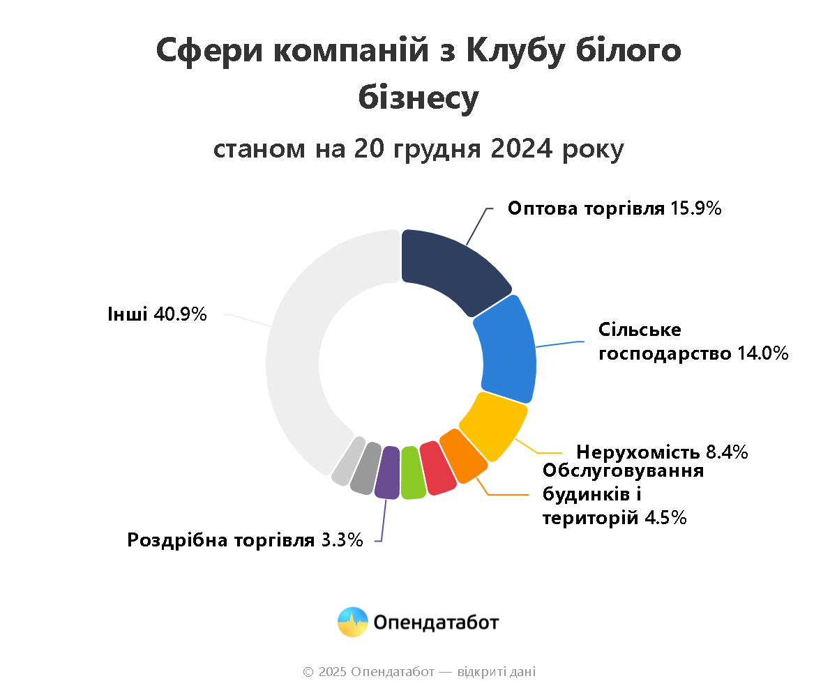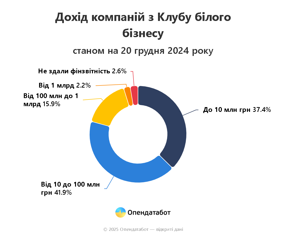По данным "Опендатабот", 42% компаний из "Клуба белого бизнеса" зарабатывают от 10 до 100 миллионов гривен в год — это 3,3 тысячи бизнесов. Еще 177 компаний могут похвастаться доходом более 1 миллиарда гривен (2,2%).
