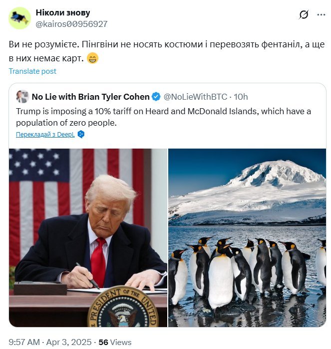 Напомним, Трамп 2 апреля ввел широкомасштабные пошлины против многих стран. Но в этом списке появились неожиданные позиции. Так, США решили ввести пошлины против островов, где живут только пингвины.
