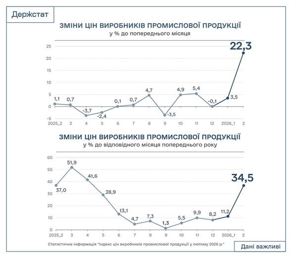 В феврале 2026 г. в Украине наблюдался резкий рост цен производителей промышленной продукции. По сравнению с предыдущим месяцем показатель вырос на 22,3%, а в годовом исчислении - на 34,5% по сравнению с февралем 2025 года.