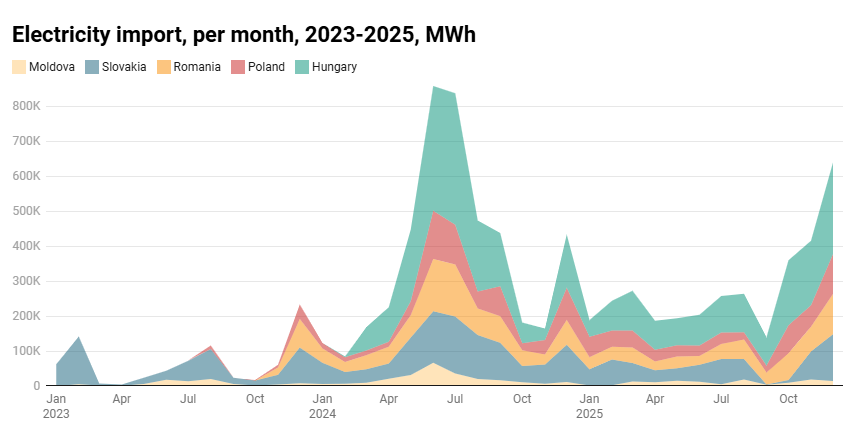 В декабре 2025 года Украина увеличила импорт электроэнергии на 53% по сравнению с ноябрем, достигнув отметки почти в 640 тыс. МВт-час. Этот показатель стал рекордным всего 2025 года.