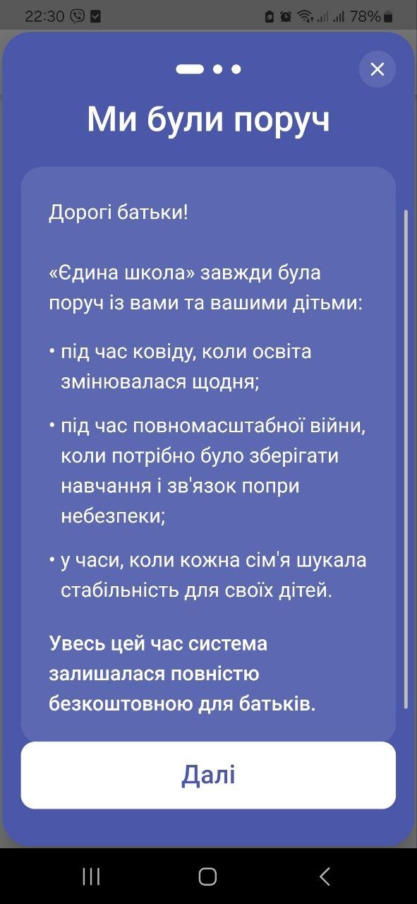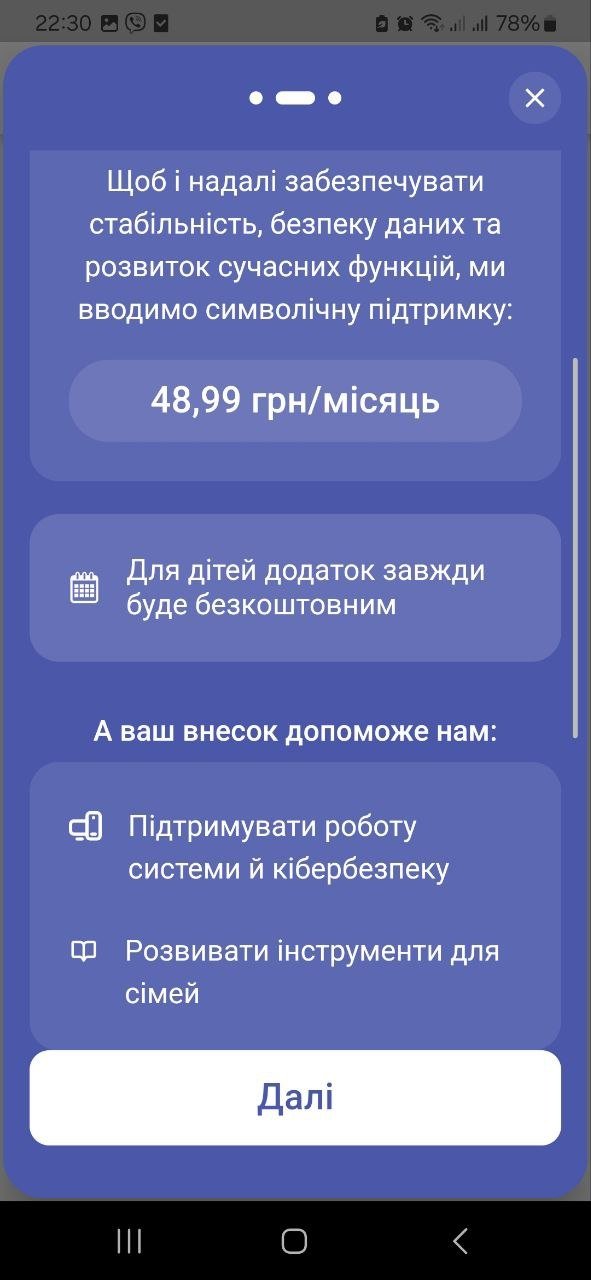 "Чтобы обеспечивать стабильность, безопасность данных и развитие современных функций мы вводим символическую поддержку: 48,99 грн/месяц", — такое объяснение увидели родители в приложении.