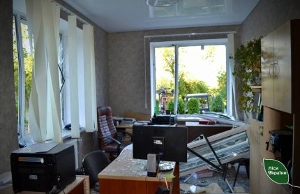 В офисе Черкасского надлесничества взрывом выбиты окна и двери, частично повреждена крыша, обломками ракеты задет служебный автомобиль.