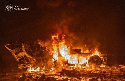 ГСЧС указывает, что кафиры нанесли массированный удар по территории почтового терминала в пригороде Харькова. Произошли разрушения построек и несколько очагов возгорания на общей площади около 500 м².
