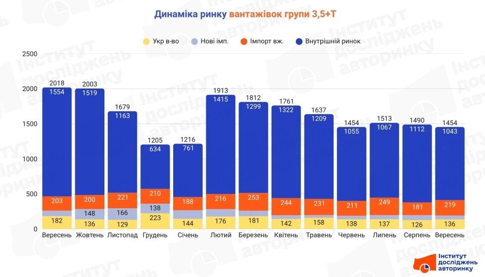 В сентябре 2025 года рынок грузовых автомобилей (с полной массой более 3500 кг) составил 1454 единицы. Это свидетельствует о падении как по сравнению с августом 2025 года (на 2,4%), так и о значительном снижении по отношению к сентябрю 2024 года (на 27,9%).