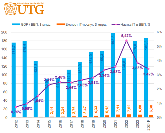 По данным аналитиков, наблюдается снижение доли ИТ-сектора в ВВП (с 5,42% в 2022 году до 3,42% в 2024-м) и объема экспорта ИТ-услуг ($6,38 млрд в 2024 году против $7,52 млрд в 2022-м).