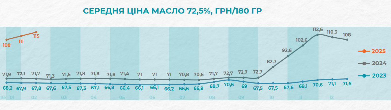 Стоит отметить, что средняя цена на сливочное масло с начала 2023 года в феврале 2025 года выросла почти на 60%. Тогда она составляла 68,2 грн, а на начало 2024-го – 71,9 грн.