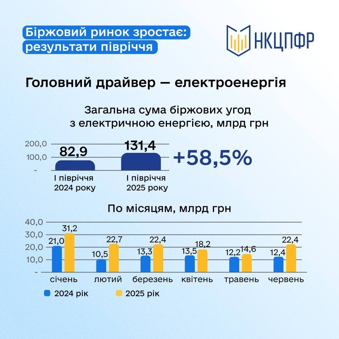 Общая сумма биржевых сделок с электрической энергией выросла на 58,5% и достигла 131,4 миллиарда гривен, тогда как за аналогичный период 2024-го составила 82,9 миллиарда гривен.