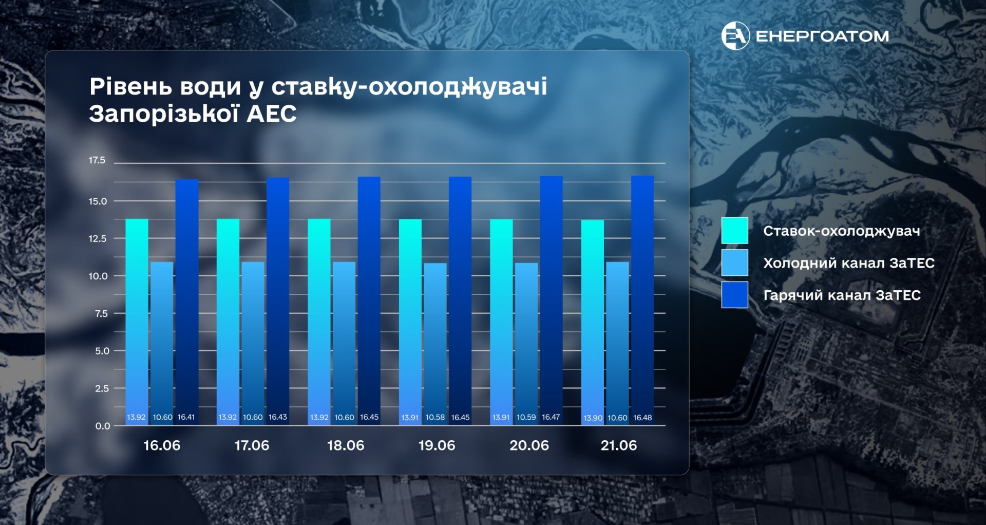 В настоящее время уровень воды в пруду-охладителе Запорожской атомной электростанции составляет 13.88 м. Уровень воды в «горячем» канале Запорожской ТЭС, откуда при необходимости подпитывается пруд ЗАЭС – 16,43 м. В «холодном» канале УТЭС уровень воды достигает отметки 10,60 м.