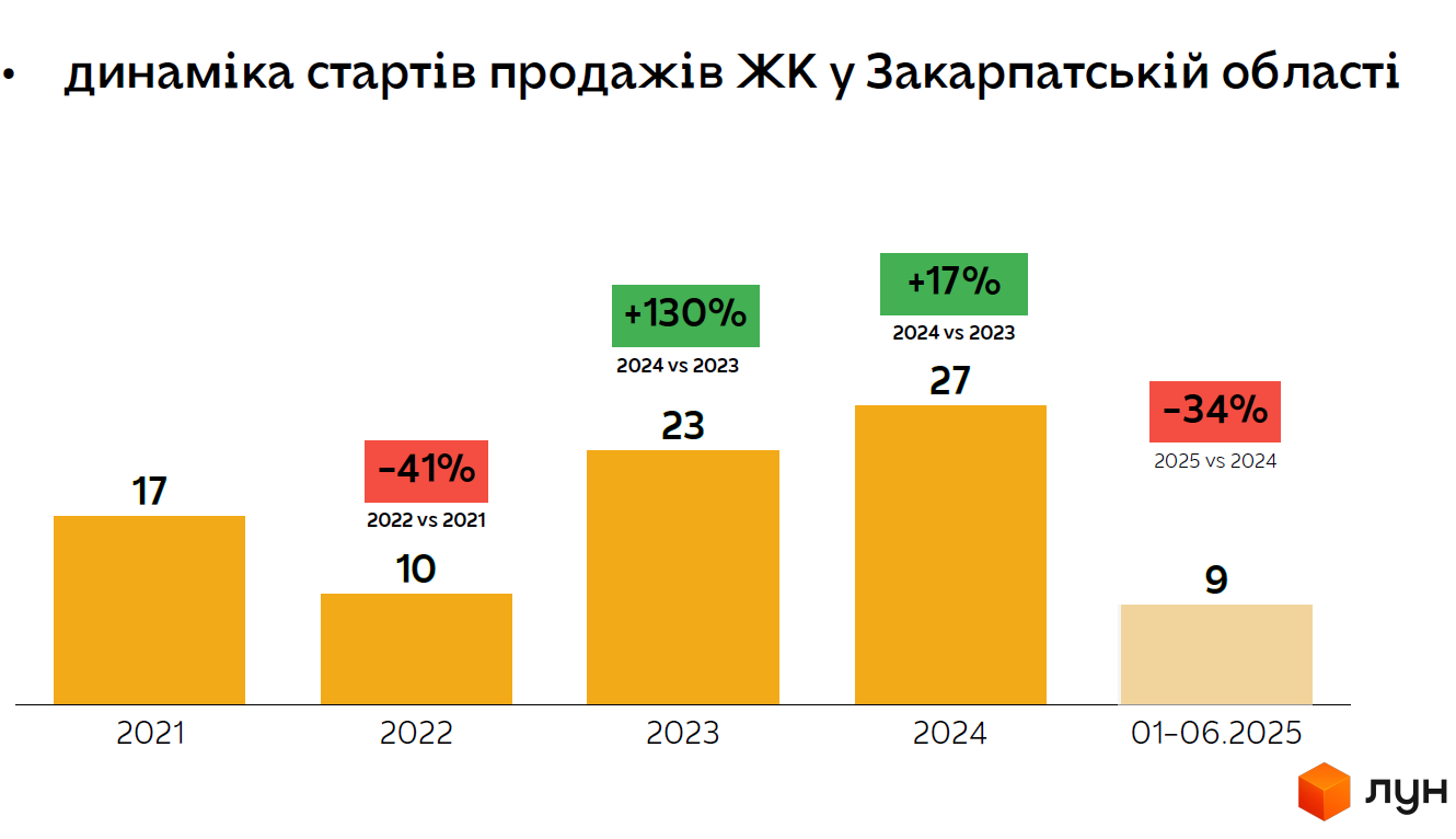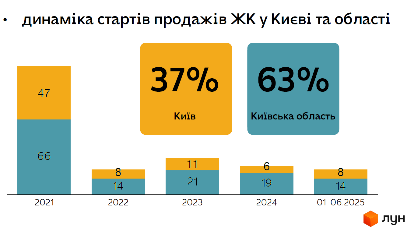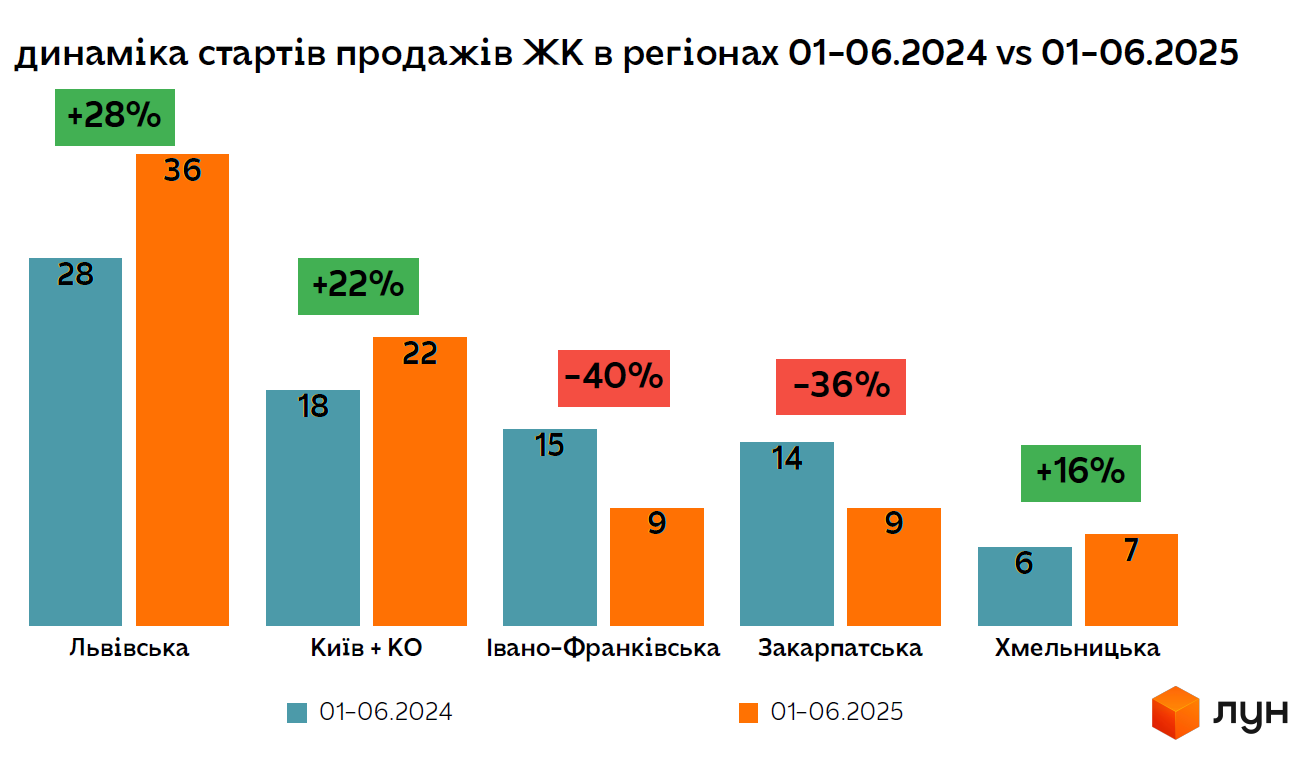 "Здесь запустилось в полтора раза больше ЖК, чем в Киеве и области. Далее следует Ивано-Франковская, Закарпатская и Хмельницкая области", - отметила эксперт.