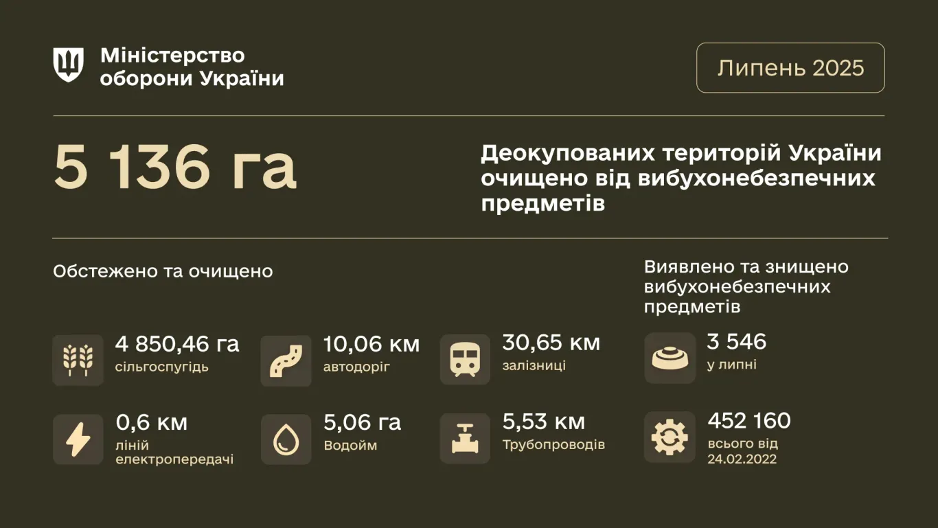 В июле 2025 года подразделения разминирования Министерства обороны очистили 5 136 га деоккупированных территорий от взрывоопасных предметов.