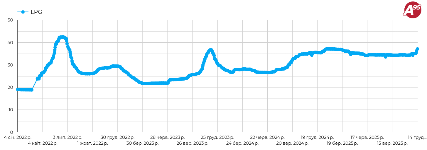 Согласно мониторингу Консалтинговой группы А-95, только за неделю (с 8 по 15 декабря) средняя цена ресурса на АЗК выросла на 2,01 грн за литр и достигла отметки 37,14 грн/л.