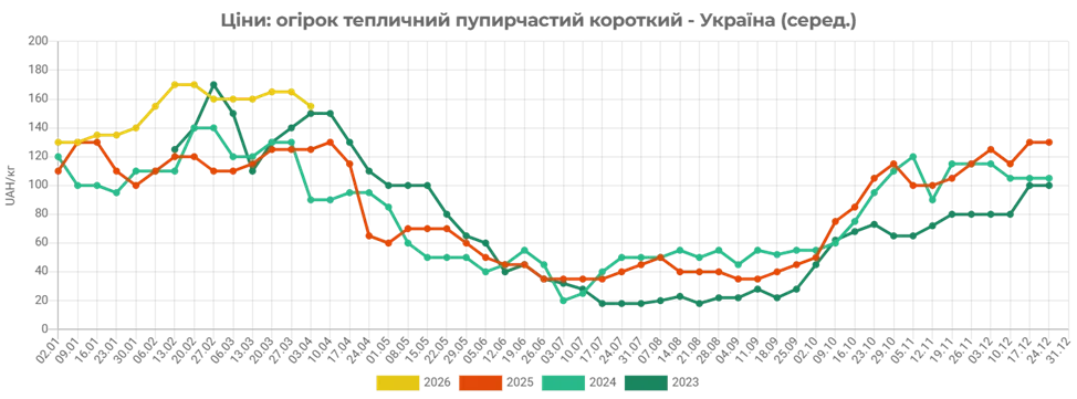 Пока украинские тепличные комбинаты продают огурцы по 125–165 грн/кг, что в среднем на 10% дешевле, чем неделей ранее.