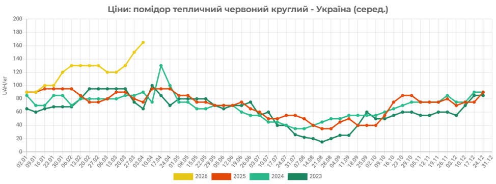 При этом основное предложение на украинском рынке по-прежнему представляют импортные овощи из Турции. Аналитики отмечают, что турецкие помидоры предлагаются несколько дешевле, чем продукция местных теплиц. Цены на импортные томаты колеблются в пределах 130–150 грн/кг в зависимости от качества и объемов партий.