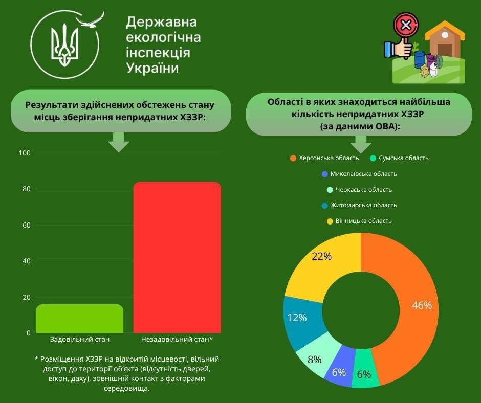 По данным Национального управления отходами, к 2033 году в Украине подлежит утилизации около 8500 тонн таких опасных веществ. Наиболее поражены сельские районы, где ХЗЗР хранились без надлежащего учета и защиты.