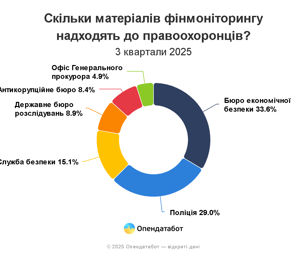 Больше всего Госфинмониторинг загрузил работой Бюро экономической безопасности Украины: в них направлено более трети материалов по всему объему на общую сумму 99,3 млрд грн. К остальным правоохранителям пошли сообщения на более скромные суммы: