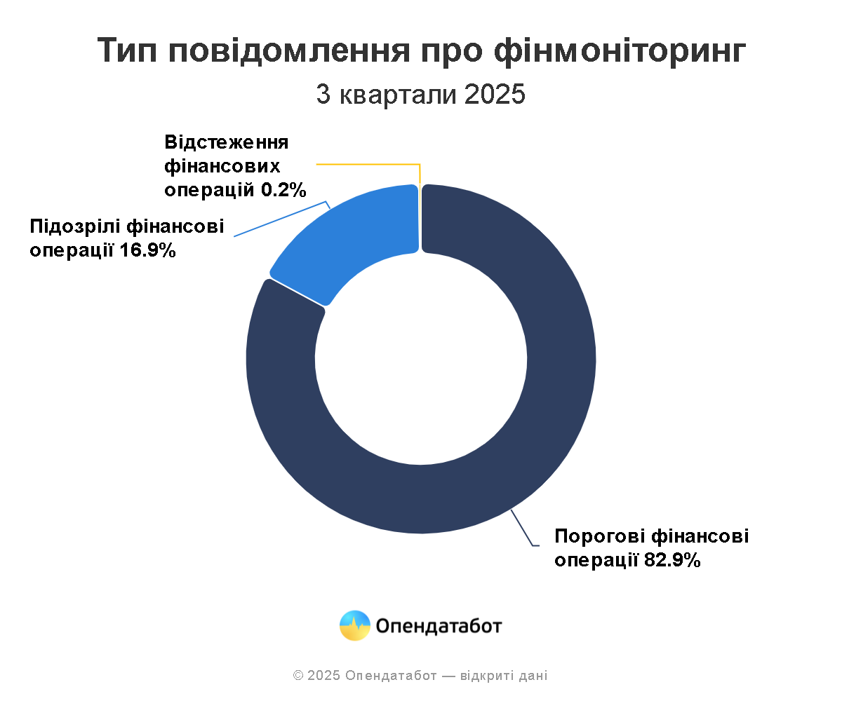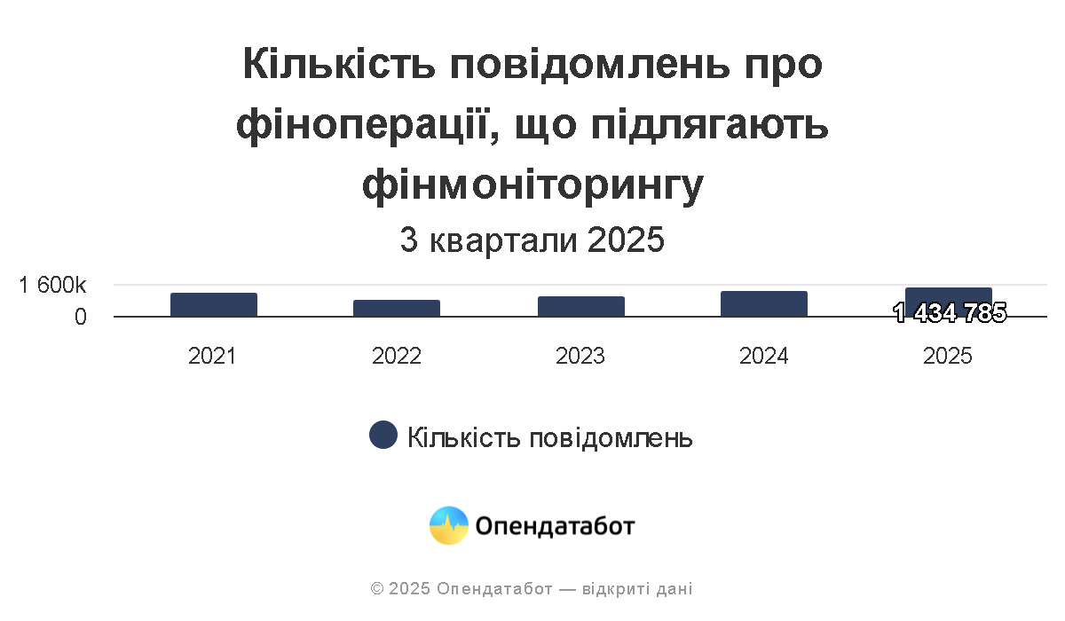 Более 1,4 млн сообщений о подлежащих финмониторингу финансовых операциях поступило в Государственную службу финансового мониторинга за три квартала 2025 года. Это на 10% больше, чем за аналогичный период в прошлом году. Подавляющее большинство – 83% сообщений – касаются пороговых операций. В общей сложности 794 материала на сумму 150,46 млрд грн были переданы в правоохранительные органы для расследования.