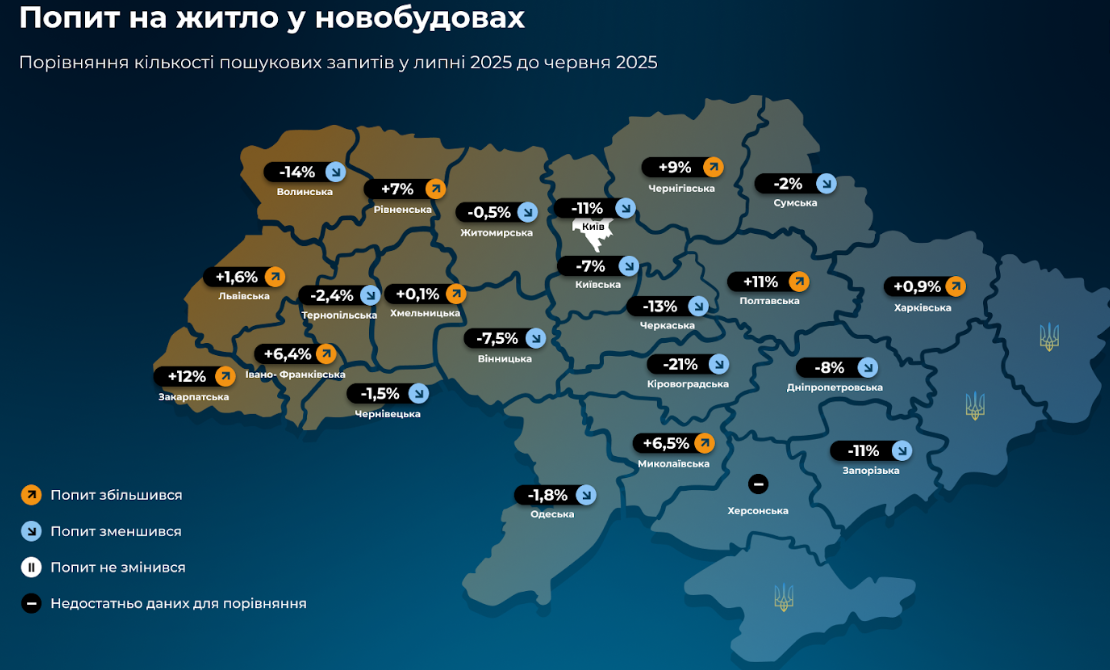 Интерес к новостройкам среди пользователей в июле отличался в регионах. В некоторых областях наблюдается значительный рост спроса – Закарпатская (+12%), Полтавская (+11%), Черниговская (+9%).