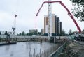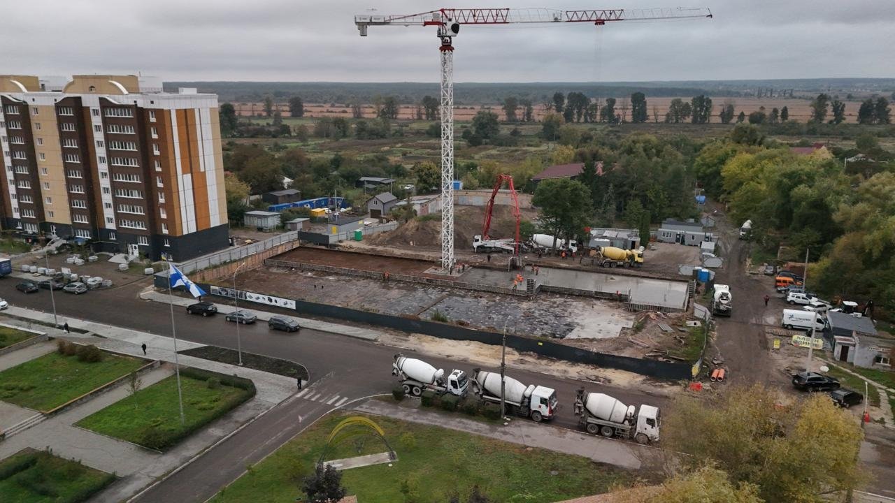 В Бородянке Киевской области продолжается строительство девятиэтажного жилого дома на месте разрушенной оккупантами многоэтажки на улице Центральной, 359. Уже завершено бетонирование фундаментной плиты паркинга.