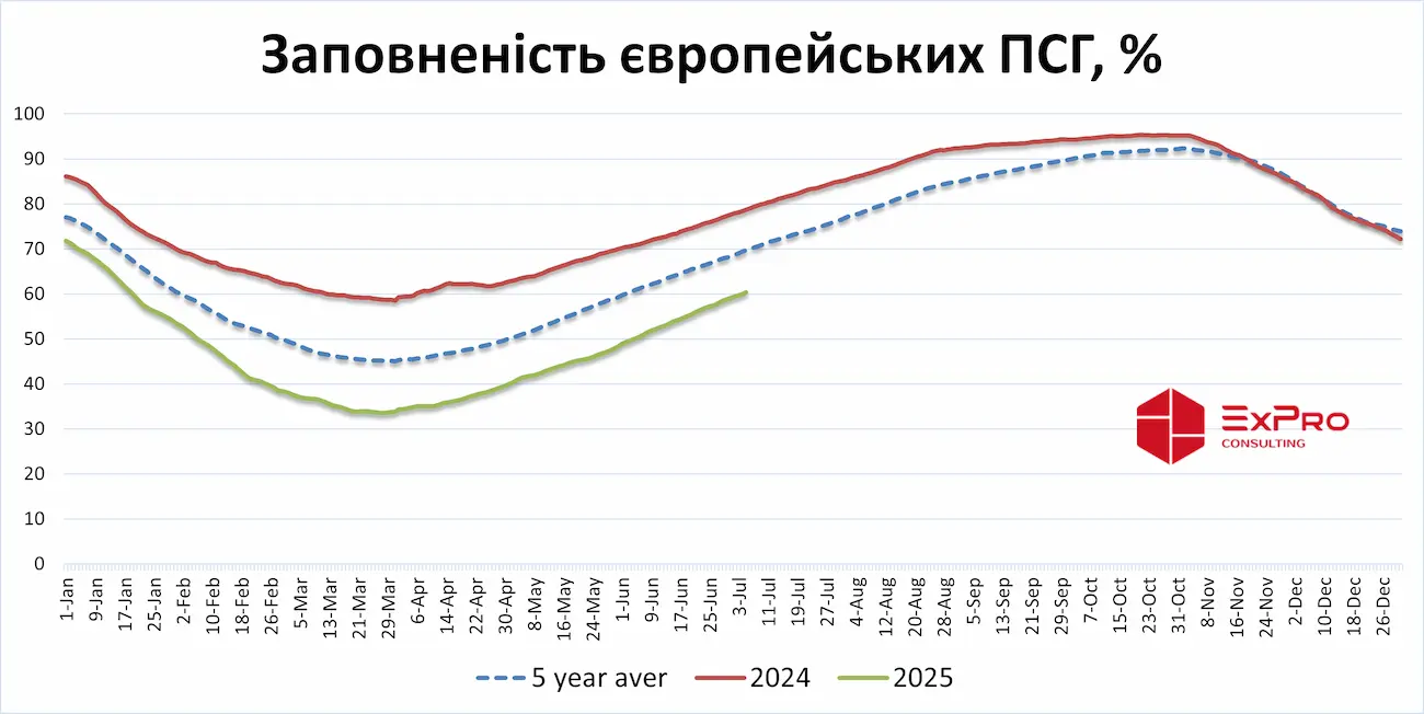 По состоянию на 5 июля, европейские подземные хранилища газа заполнены более чем на 60%. В хранилищах хранится 64,5 млрд куб. м природного газа.