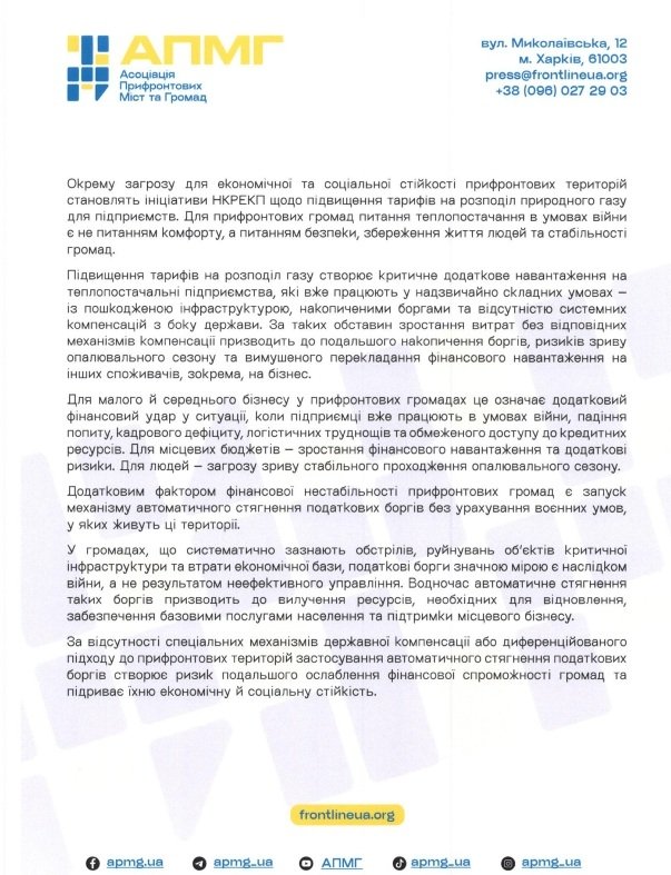 Отдельную угрозу финансовой стабильности составляет запуск механизма автоматического взыскания налоговых долгов без учета военных условий, говорится в обращении. В прифронтовых общинах такие долги в значительной степени возникли из-за боевых действий, разрушения экономической и критической инфраструктуры, а не из-за нарушения налоговой дисциплины. Их автоматическое взыскание лишает общины ресурсов, необходимых для восстановления, обеспечения базовых услуг и поддержки местного бизнеса, добавляют в ассоциации.