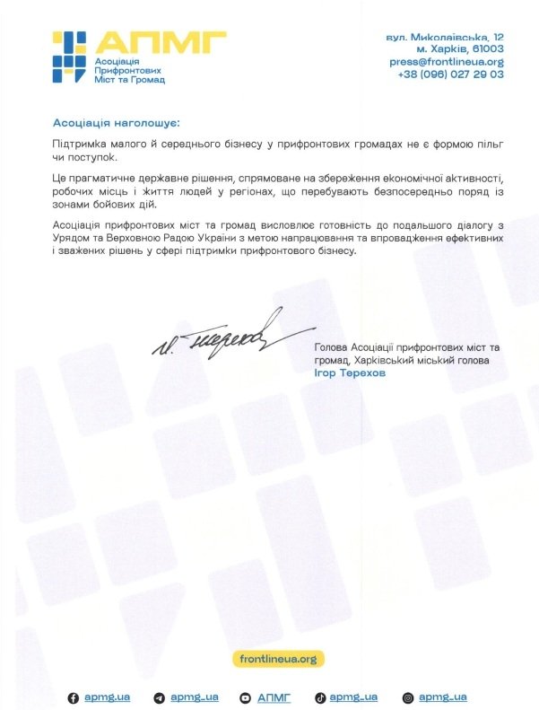 "Поддержка малого и среднего бизнеса в прифронтовых общинах – это не уступки и не привилегии. Это прагматическое государственное решение, без которого невозможно сохранить экономику, рабочие места и жизнь людей, живущих вблизи к войне", – отметил мэр Харькова, глава Ассоциации прифронтовых городов и общин Игорь Терехов.