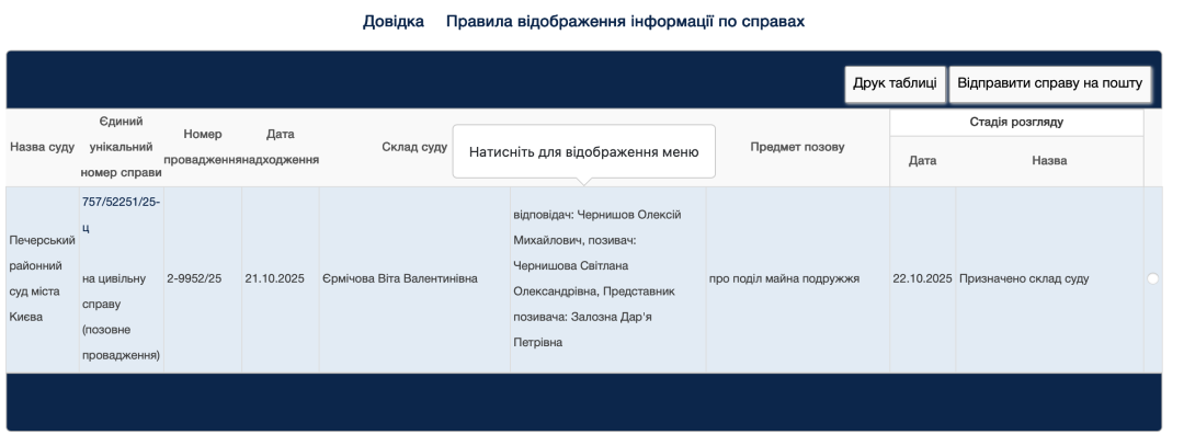 Согласно данным портала, иск был зарегистрирован 22 октября 2025 года, и по делу уже определен состав суда. Ей присвоен единственный уникальный номер 757/52251/25-ц и номер производства 2-9952/25.