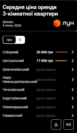 Цена аренды трехкомнатной квартиры в Днепре также несколько упала, как у двухкомнатных. В среднем цена на аренду трехкомнатных квартир снизилась на 5,88%. В начале декабря 2025 г. аренда трехкомнатных стоила около 17 000 грн, а в начале января цена составляла 16 000 грн.
