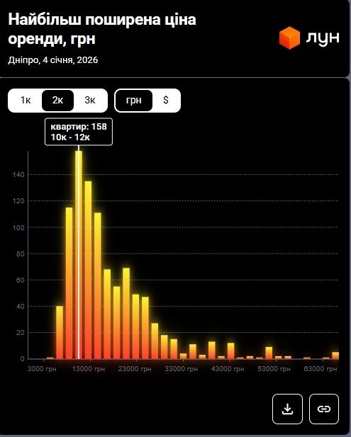 Согласно данным ЛУН Статистика, на январь 2026 года наиболее распространенная цена аренды 2-комнатных квартир в Днепре составляет 10 000 – 12 000 грн.