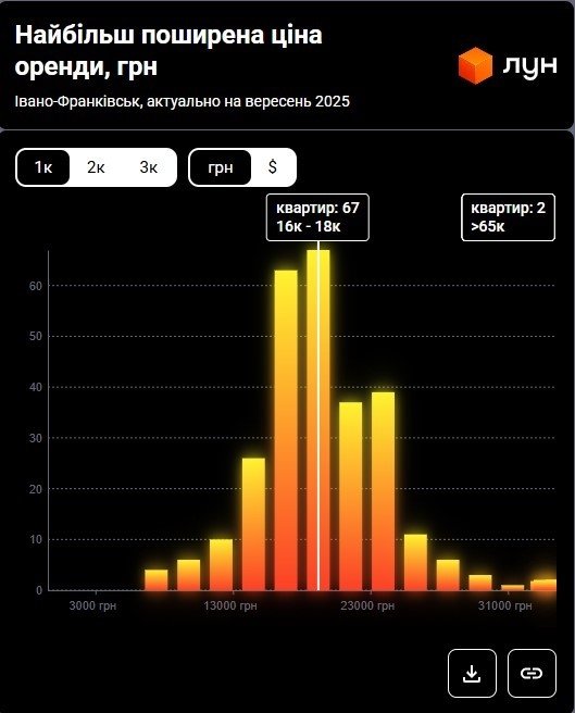 Согласно данным ЛУН Статистика, на сентябрь 2025 года наиболее распространенная цена аренды 1-комнатных квартир в Ивано-Франковске составляет 16 000 – 18 000 грн.