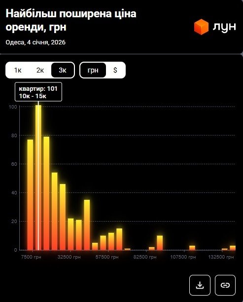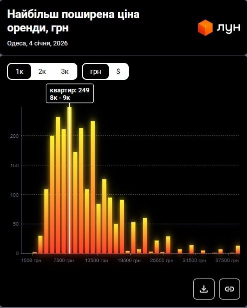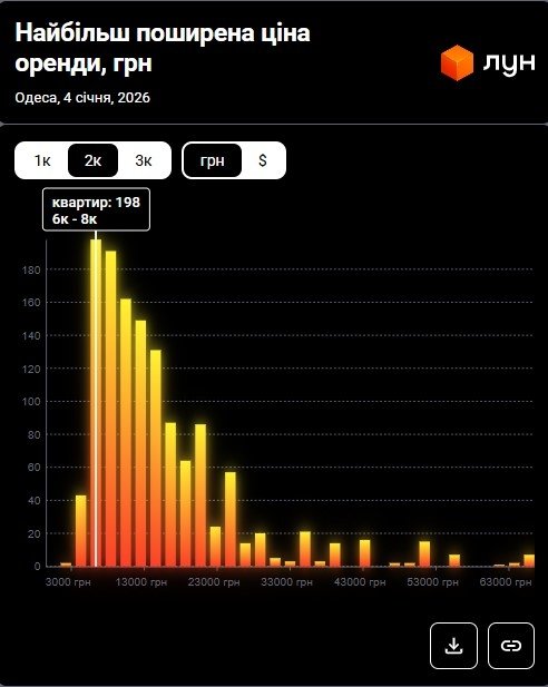 В то же время, согласно данным M2bomber, по состоянию на январь 2026 года наиболее распространенная цена аренды 1-комнатных квартир в Одессе составляет 6 000 грн, и по такой цене сдается 20% однокомнатных квартир.