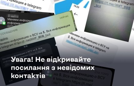 "Если вам поступило сообщение с таким текстом: "Меняем информацию о ВСУ на $. Вся информация в Тelegram ...", ни в коем случае не открывайте его и не переходите по ссылкам, которые там размещены", - говорится в сообщении.